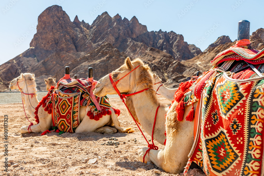 Fototapeta Harnessed riding camels resting in the desrt, Al Ula, Saudi Arabia