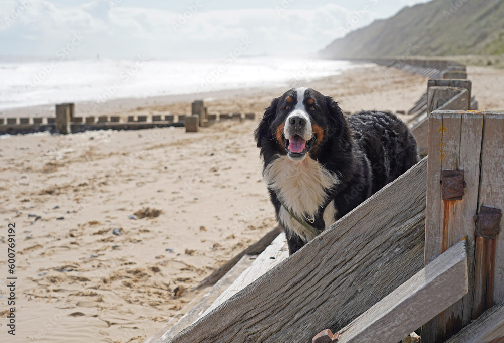 Fototapeta Large dog standing on the wooden sea defenses on the beach in Norfolk