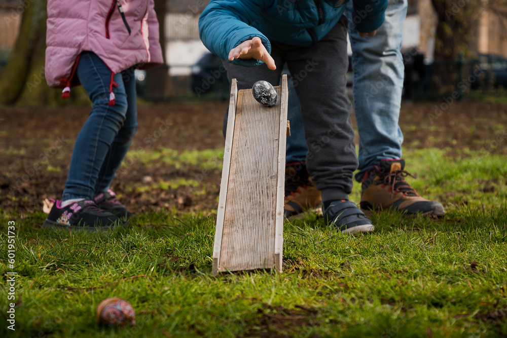 Fototapeta Easter game, egg rolling 09 04 2023, Scotland, Cupar town, Haugh Park