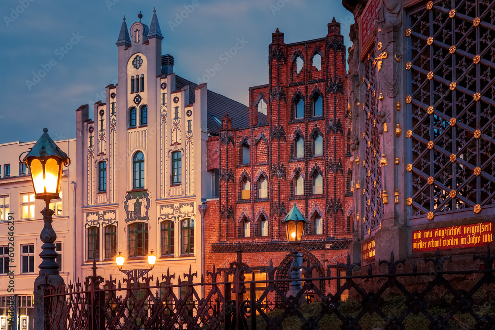 Fototapeta Marktplatz der Hansestadt Wismar mit Brunnen Wasserkunst im Abendlicht