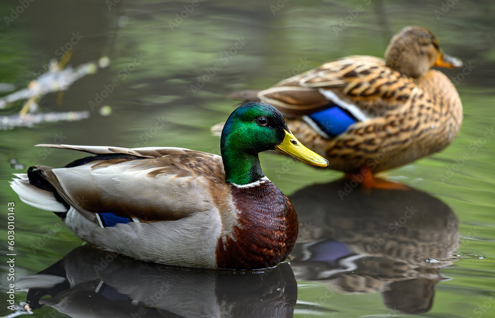 Fototapeta Male and female mallard ducks standing in a lake in Kent, UK