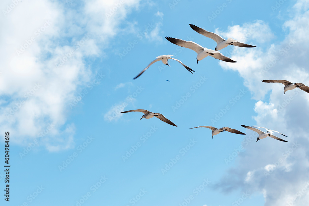 Fototapeta A flock of seagulls flying in a blue clear sky