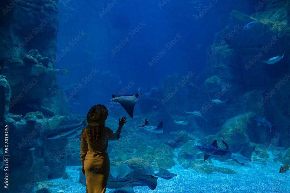 Fototapeta A young woman touches a stingray fish in an oceanarium tunnel