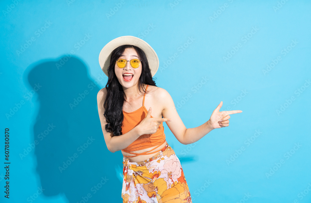 Fototapeta Portrait of a beautiful asian girl in a swimsuit smiling happily on a blue backg