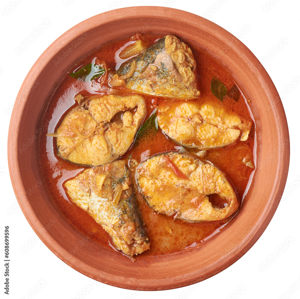 Fototapeta spicy and hot fish curry in a clay pot or bowl isolated background, seafood cook