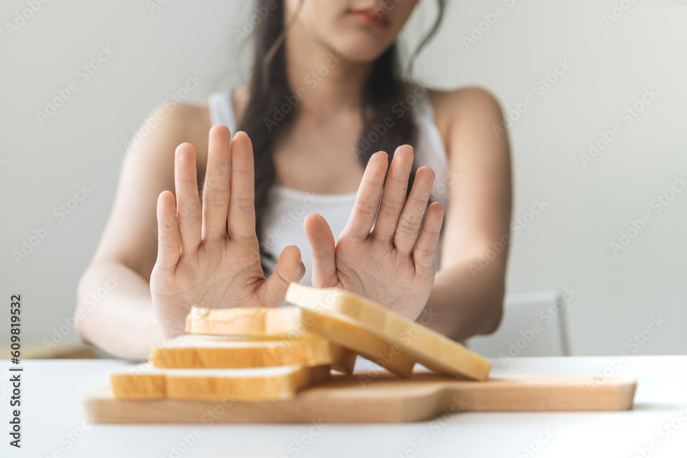 Fototapeta Gluten allergy, asian young woman hand push out, refusing to eat white bread slice on chopping board in food meal at home, girl having a stomach ache