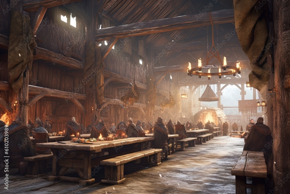 Fototapeta Rustic Viking feast hall, where long wooden tables are laden with roasted meats,