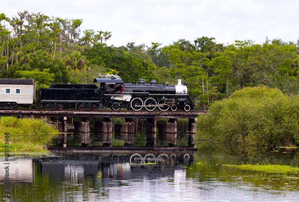 Fototapeta Steam train crossing a train trestle