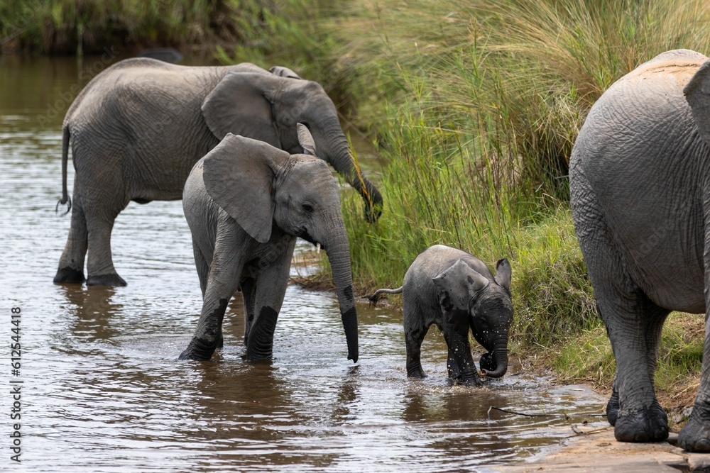 Fototapeta Herd of elephants on a river in the wilderness of Marataba, South Africa