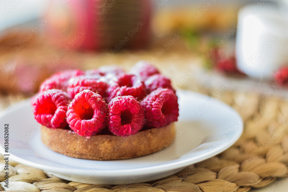 Fototapeta Krucha babeczka z malinami, ciastko z malinami, deser, fotografia kulinarna