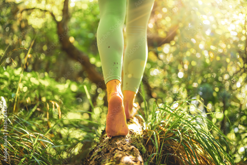 Fototapeta Legs of a woman walking barefoot on a dead tree trunk in beautiful sunny atmosphere