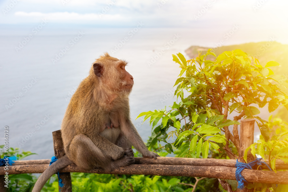 Fototapeta Wild monkey on Bali island, Indonesia sitting in front of the ocean