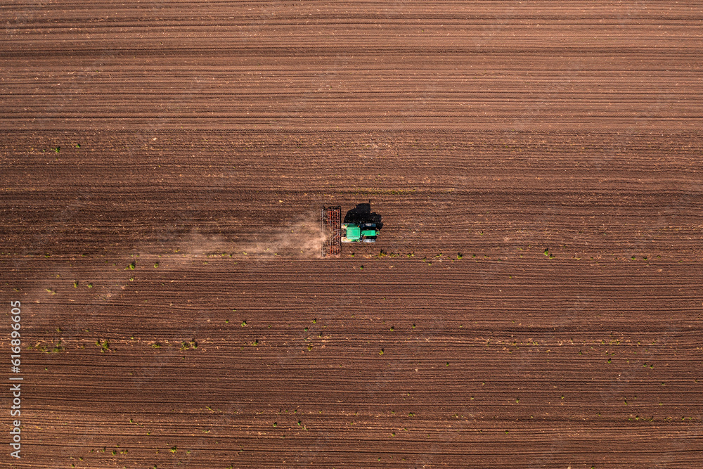 Fototapeta Agricultural tractor with tiller attached performing field tillage before the so