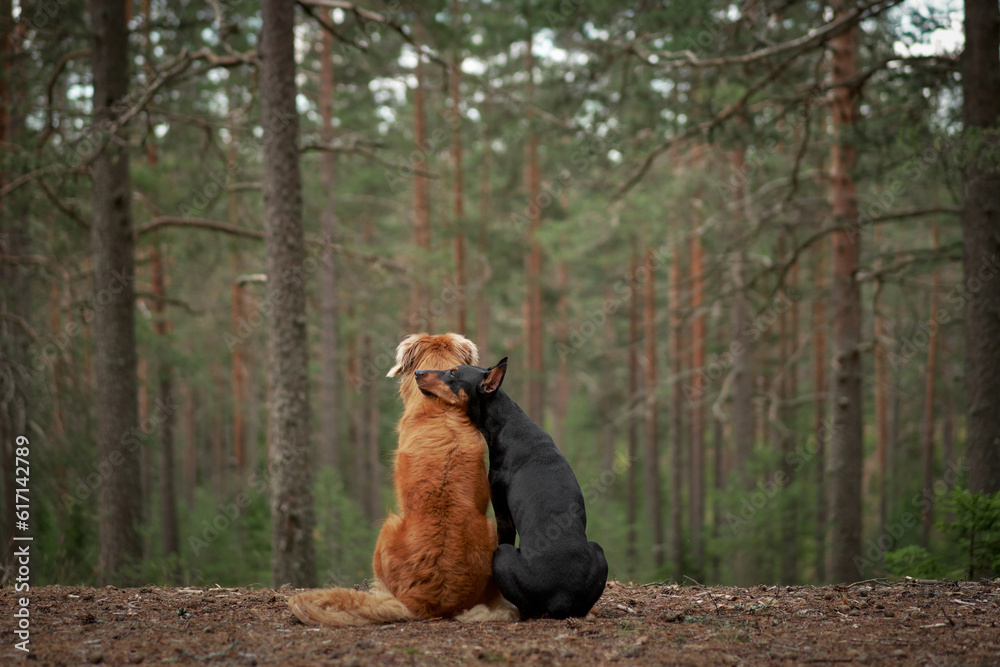 Fototapeta two dogs are hugging, sit with their backs and look at the forest