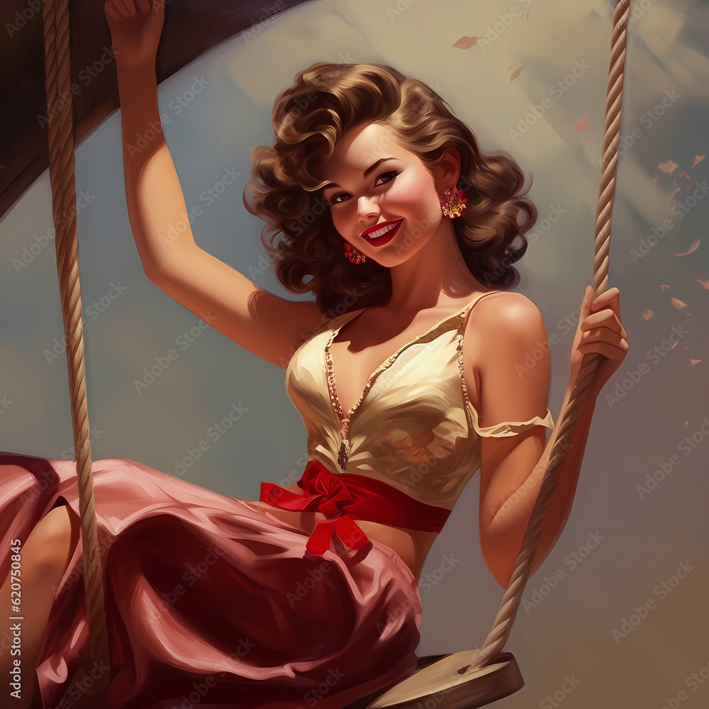 Fototapeta pin-up style painting of beautiful woman or girl on a swing