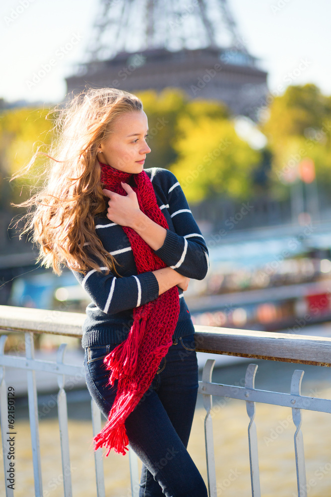 Fototapeta Young girl in red scarf on a fall day in Paris