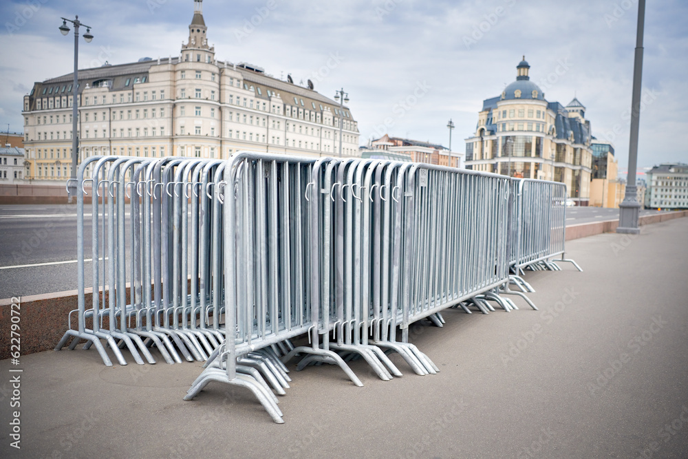 Fototapeta Folded portable temporary fence parts on sidewalk