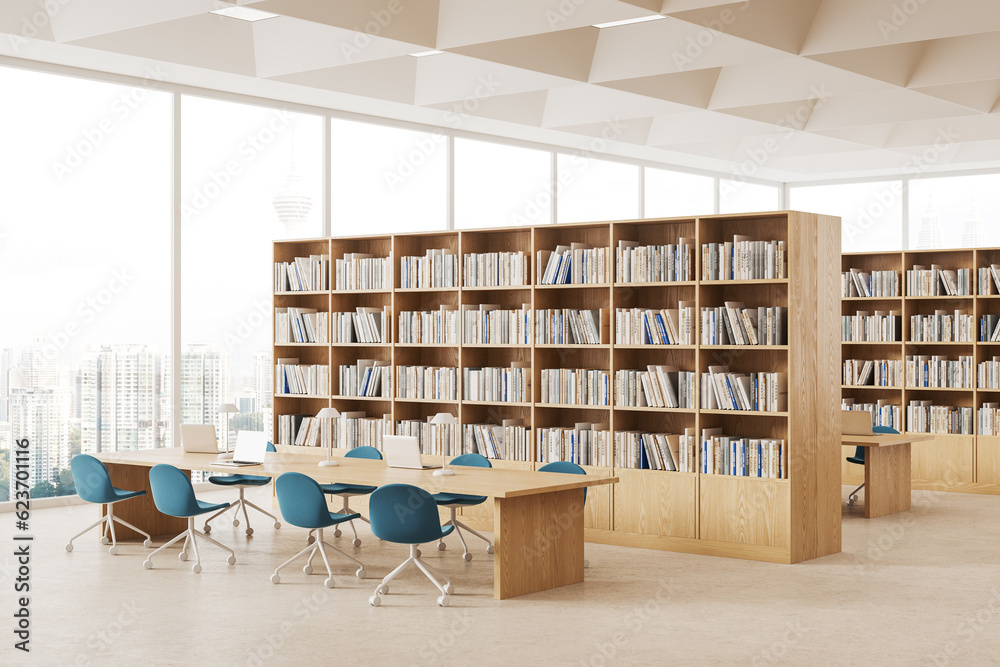 Fototapeta Cozy library interior with bookshelves and desk with laptop, window