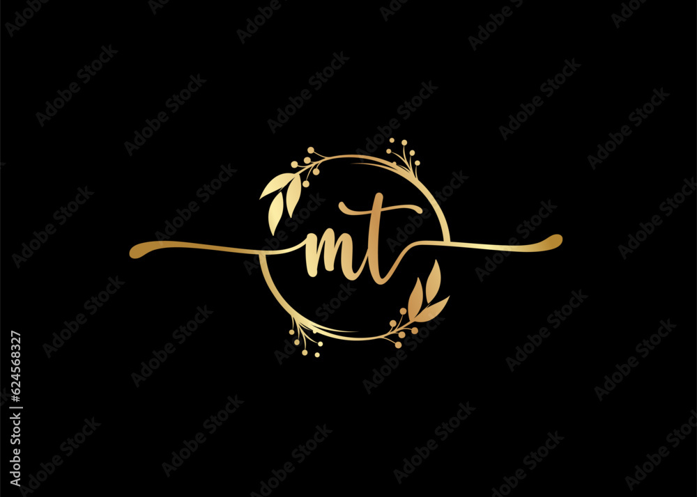 Fototapeta luxury gold signature initial mt logo design isolated leaf and flower