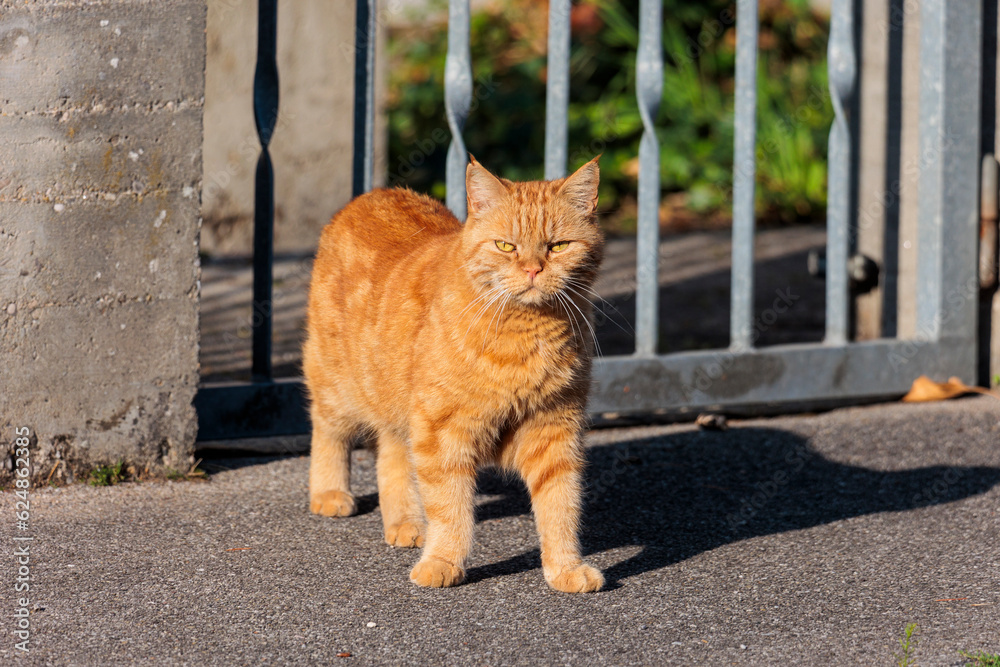 Fototapeta A red-haired British shorthair tomcat stands at the garden gate and looks critic