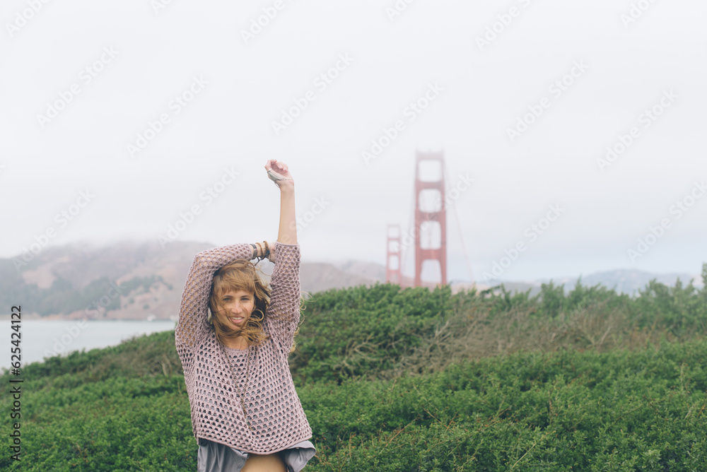 Fototapeta Young Woman in Purple Shirt by The Golden Gate Bridge