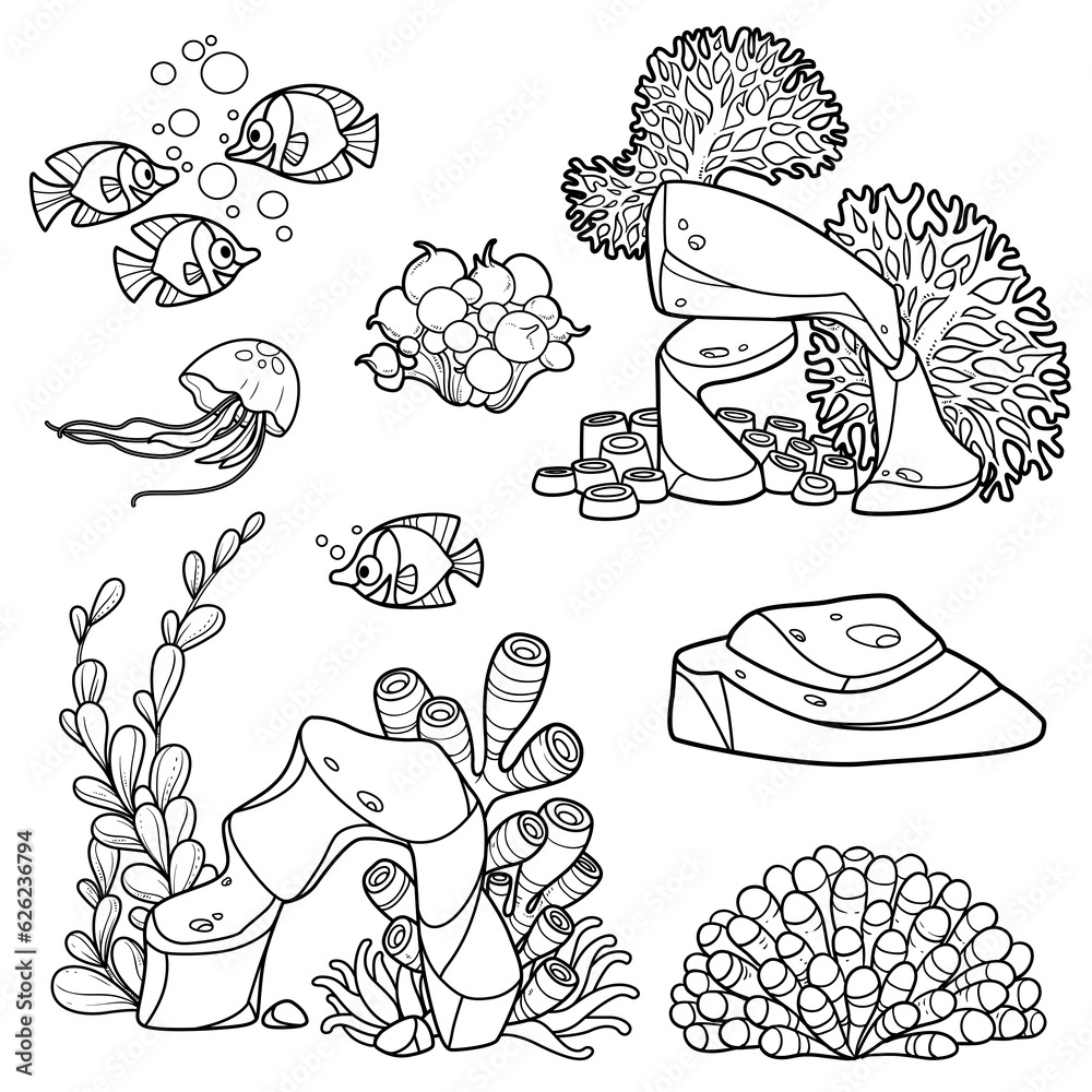 Fototapeta Coral, seaweed and anemones growing on rocks, jelyfish and fishes, sandstone set