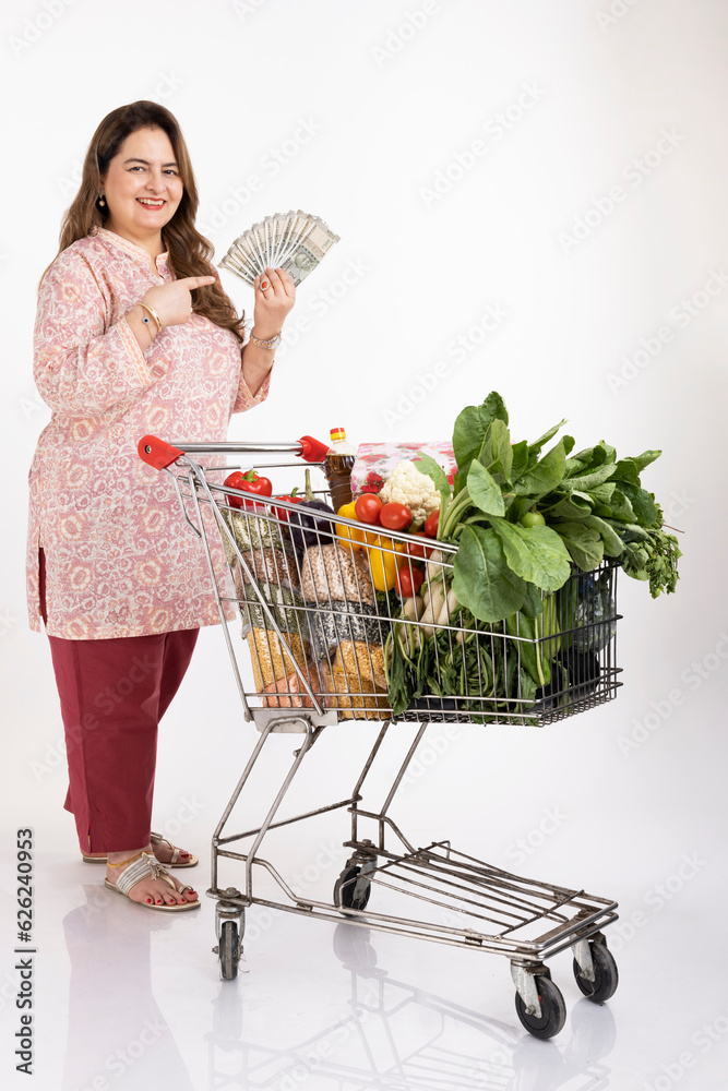 Fototapeta Happy woman posing with a shopping cart full of groceries and holding money isolated on white background