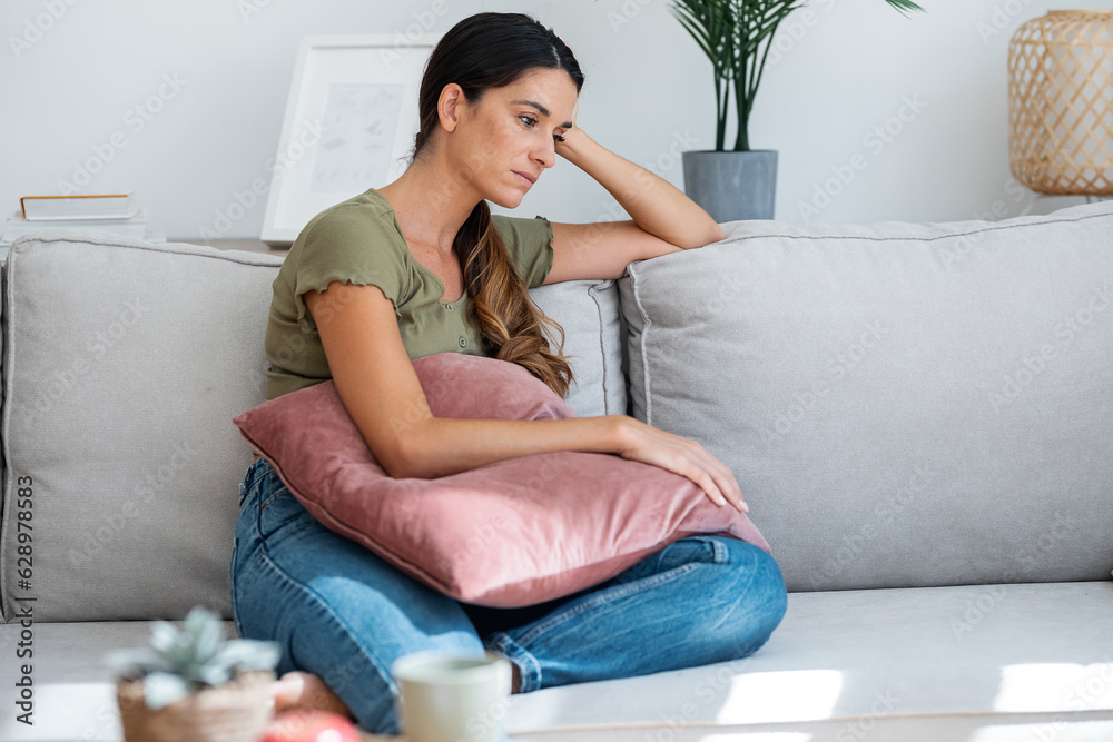 Fototapeta Worried sad woman thinking while sitting on couch in the living room at home