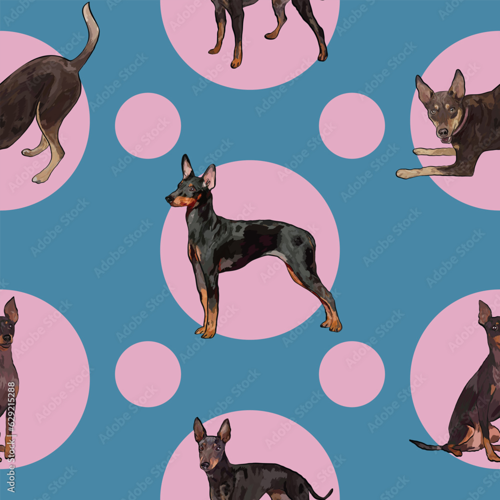 Fototapeta Seamless English toy terrier symetric pattern with blue circles