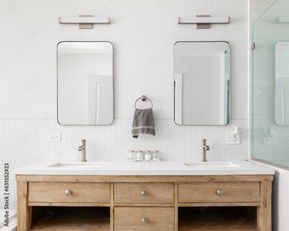 Fototapeta A cozy bathroom detail with a white oak vanity cabinet, white countertop, bronze faucets and lights and a white herringbone tile backsplash