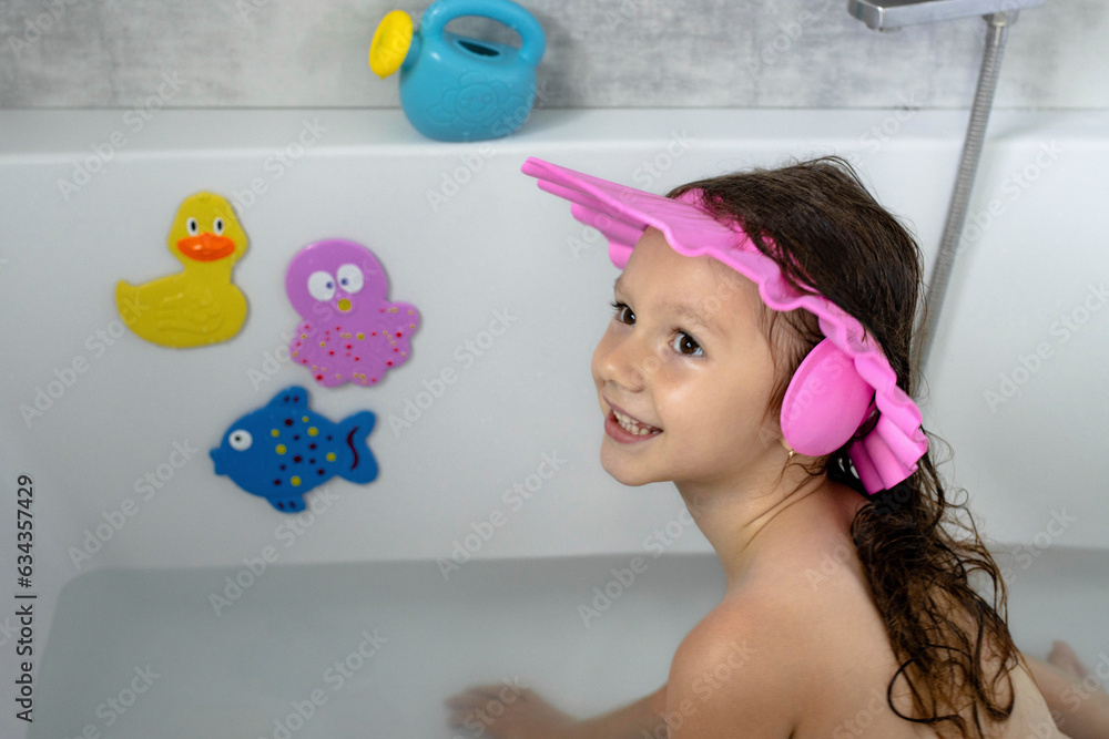Fototapeta A little smiling girl of European appearance with a funny bathing hat sits in the bathroom with toys