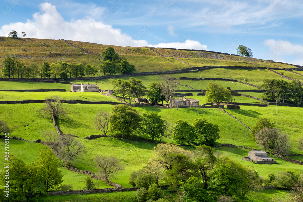Fototapeta Dry stone walls and stone cottages on a bright spring day with beautiful greens,