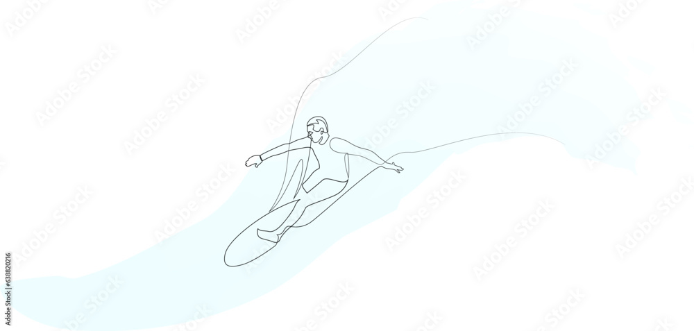 Fototapeta Continuous one line drawing of man surfing a big wave