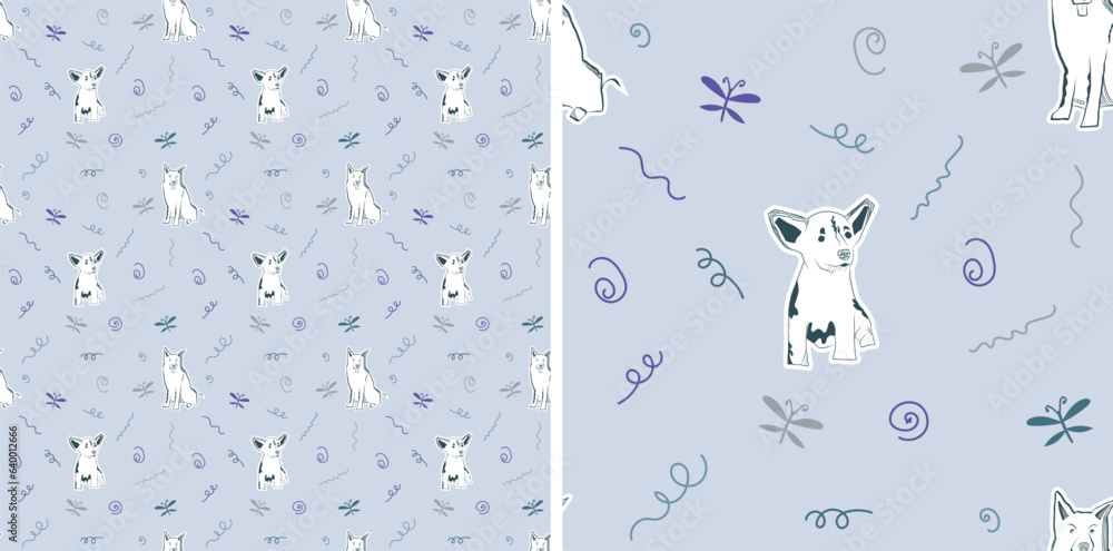 Fototapeta Two-color seamless pattern with dogs, holiday texture with mixed-breed dog in one color, line art style