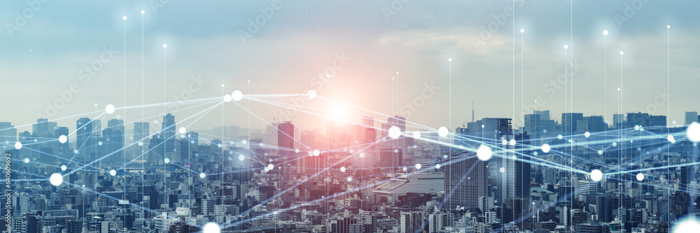 Fototapeta Modern city panorama and wireless communication network concept