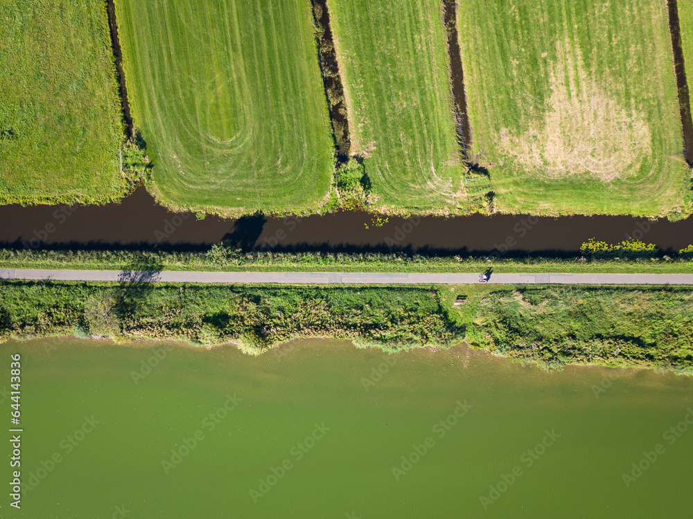 Fototapeta aerial shot of land and water, recreation meets faming at the surfplas manmade lake in Reeuwijkse plassen
