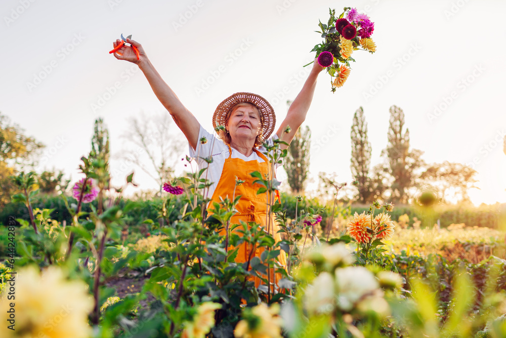 Fototapeta Happy senior gardener picking stems of dahlias on rural flower farm raising arms