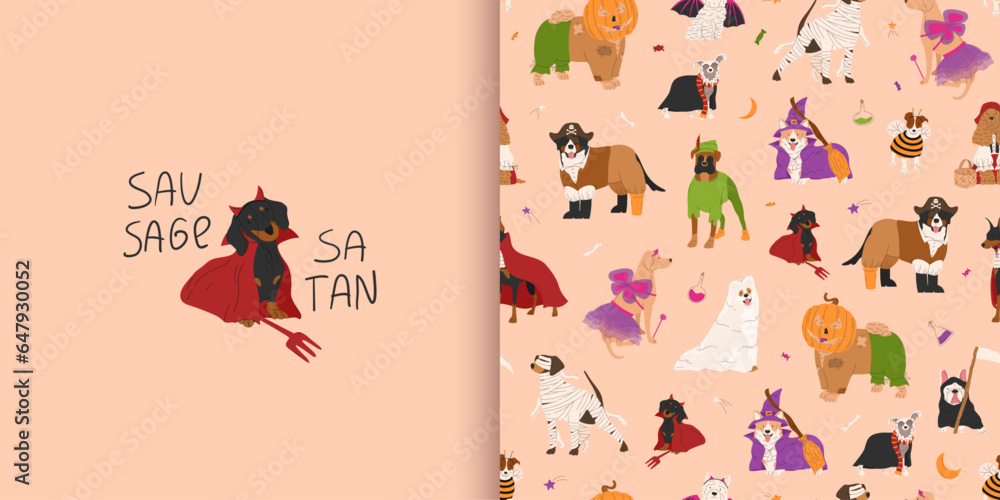 Fototapeta Halloween seamless pattern with dogs in cute halloween costumes