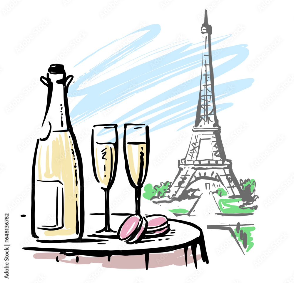 Fototapeta champagne two glass. Eiffel Tower, France, Drawing.