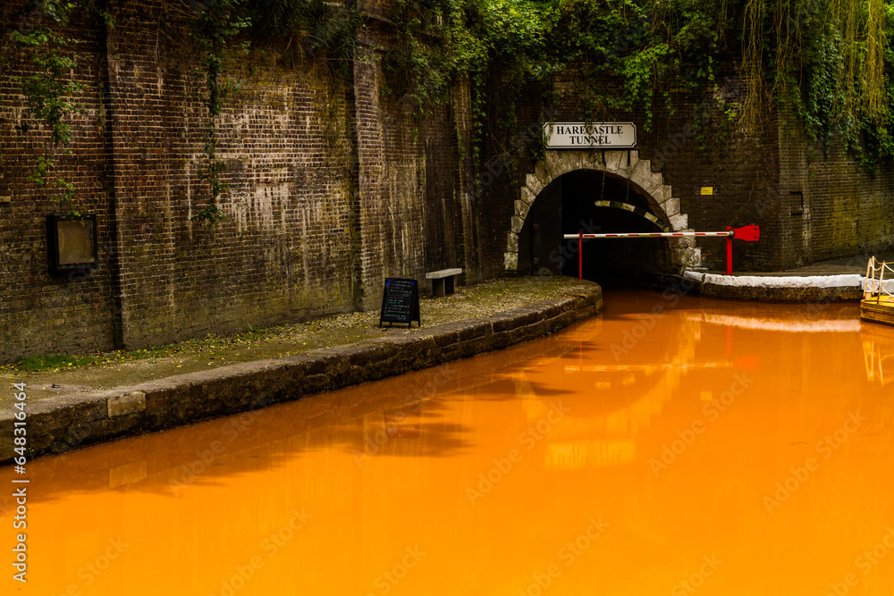 Fototapeta Orange coloured canal with northern entrance to the Harecastle Tunnel, The Trent and Mersey Canal