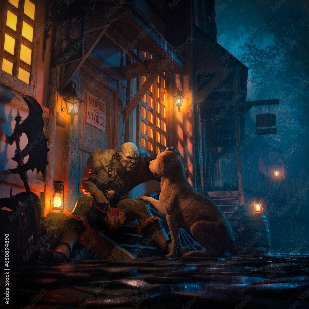 Fototapeta 3D render of a fantasy scene with an orc petting his canine companion near a bar