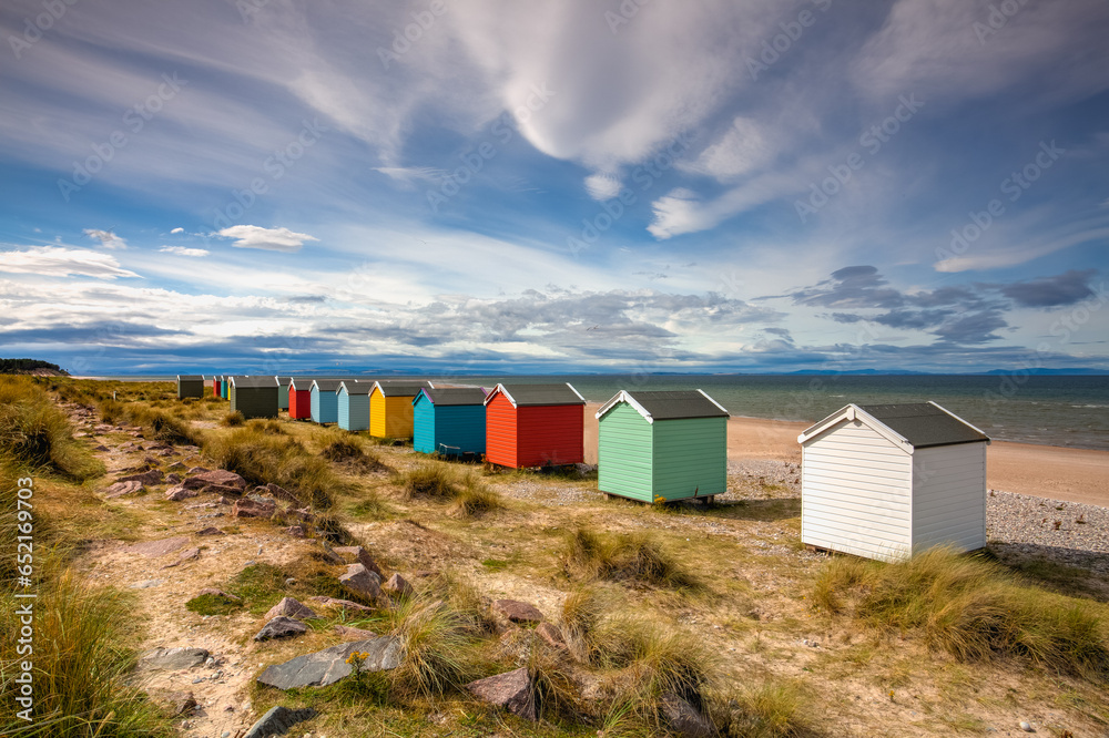 Fototapeta Colorful wooden beach huts at Findhorn beach, Moray coast, Scotl