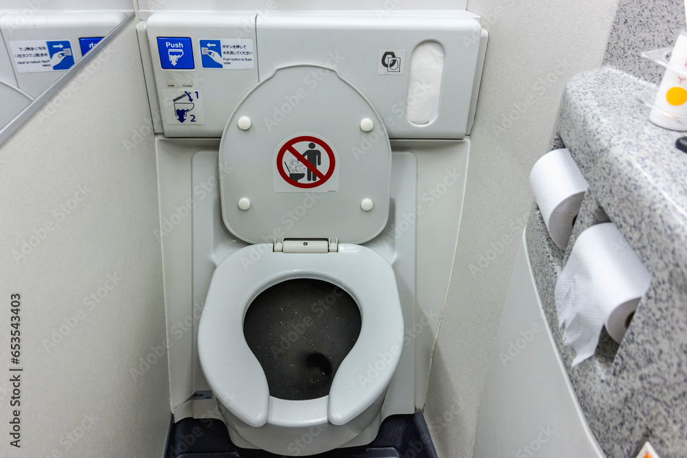 Fototapeta The toilet seat with the lid open at a aircraft lavatory
