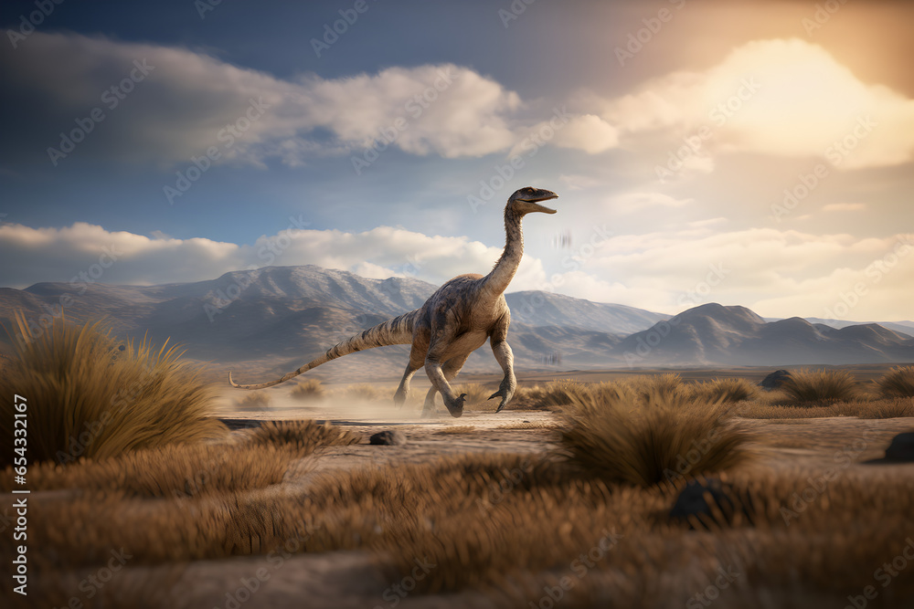 Fototapeta Gallimimus dinosaur running on prehistoric plains