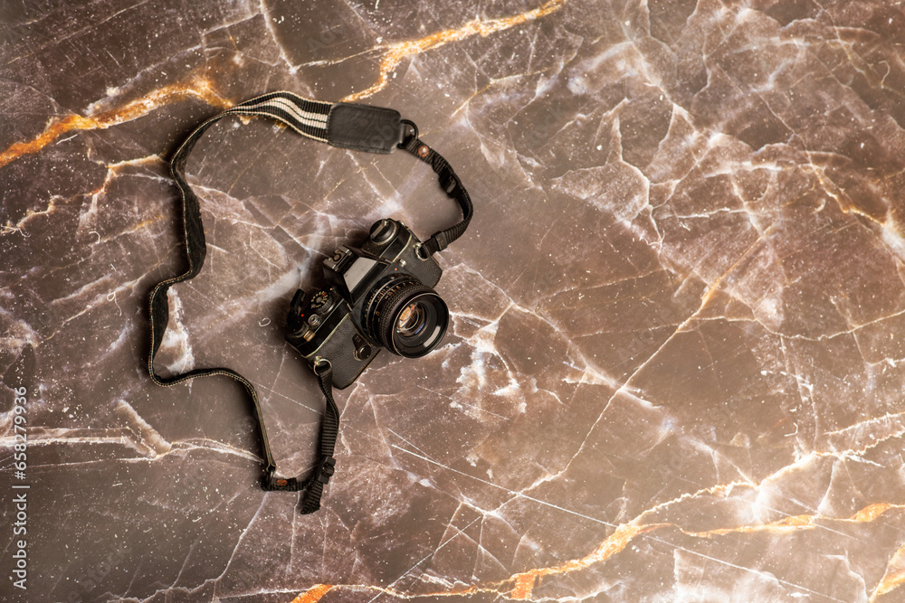 Fototapeta Old analogue SLR on wooden background