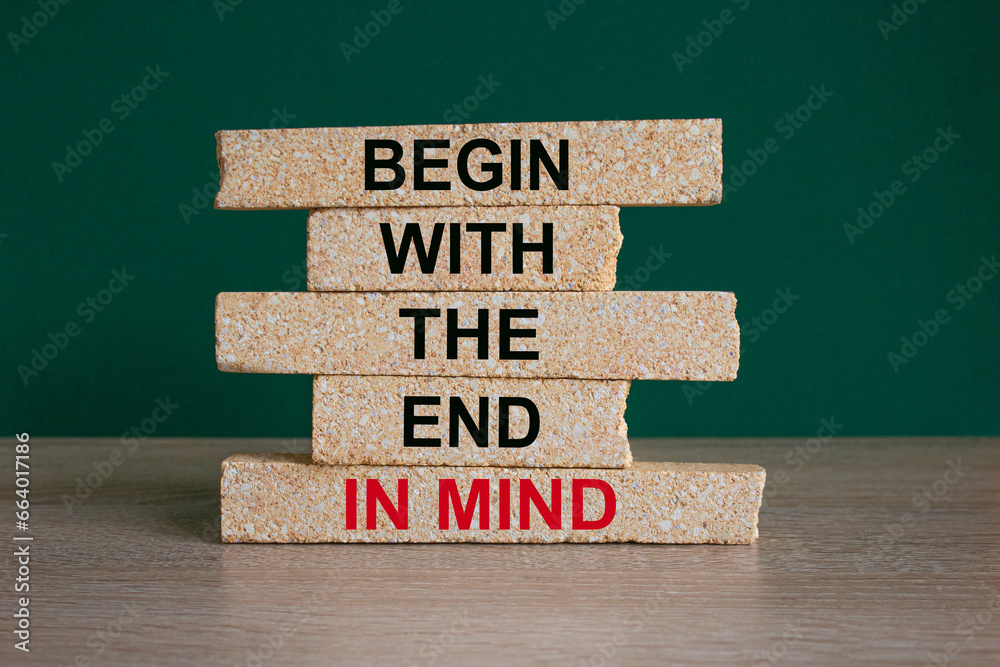 Fototapeta Concept red words Begin with the end in mind on brick blocks