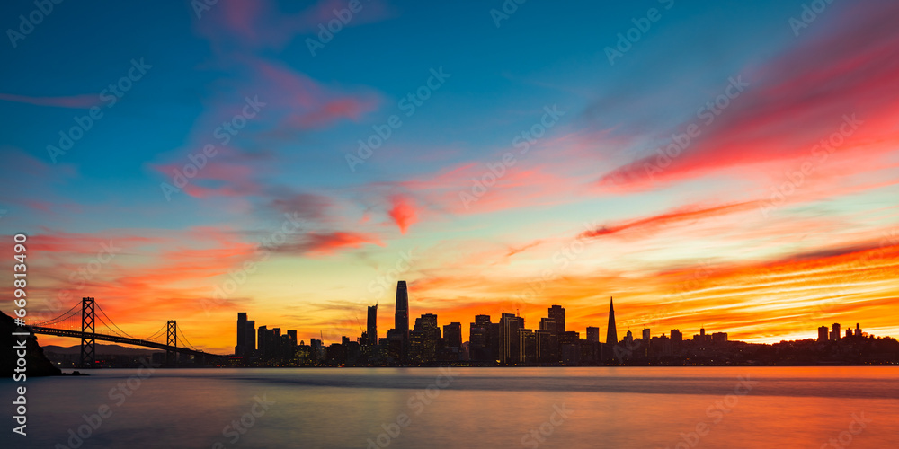 Fototapeta San Francisco Skyline Silhouette Under Vibrant Sunset