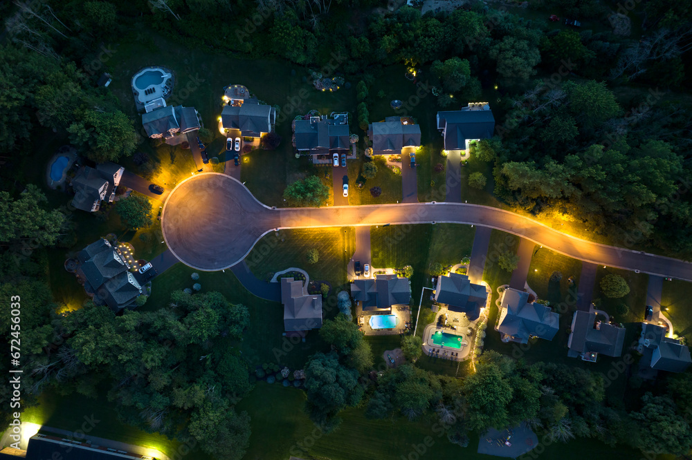 Fototapeta View from above of residential houses in living area in Rochester, NY at night