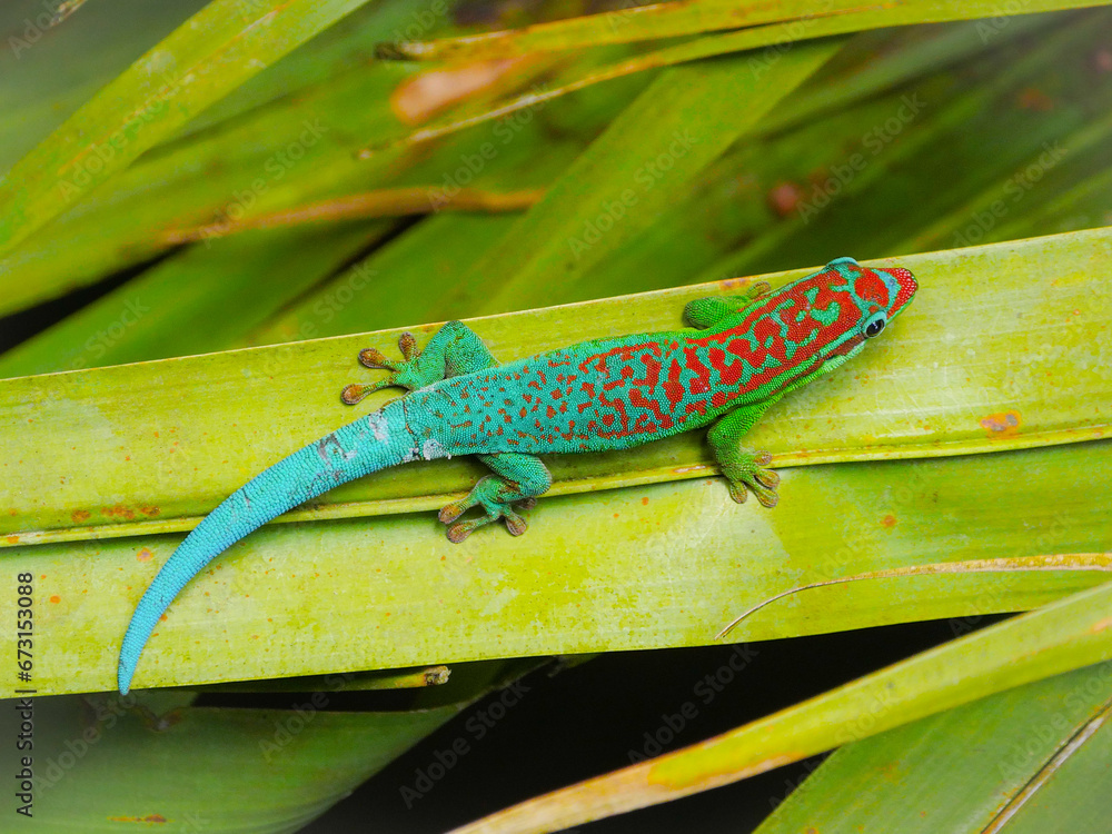 Fototapeta Turquoise green ornate day gecko on palm tree leaf