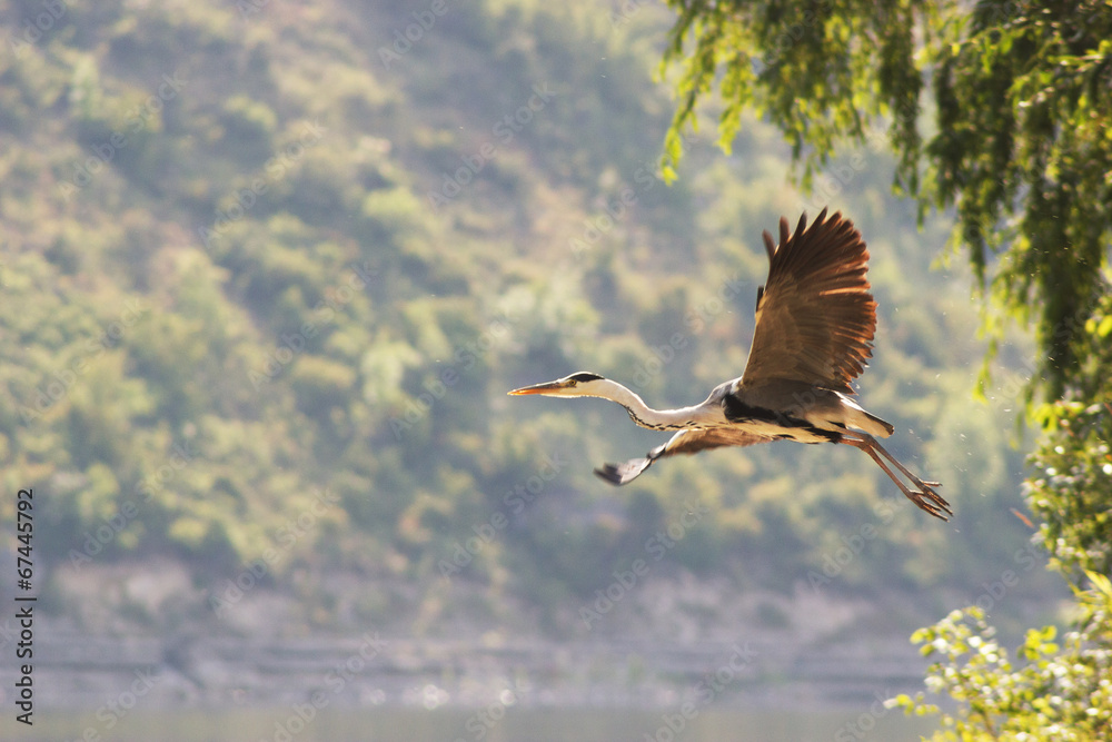 Fototapeta Grey heron flying over big river shore